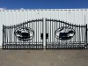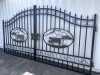 Set of 2 Large Unused Wrought Iron Style Gates with Cow Scene, Each gate is 10ft wide, Height at High Side: 2.3m, Height at Low Side: 1.8m, Made from Galvanised Steel, Total Approximate Combined Weight of both gates: 175kg EXEQ Stock No S04177